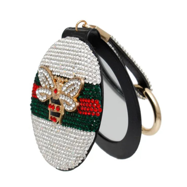 Unleash your inner diva with the Luxe Bling Bee Keychain Compact Mirror. This chic accessory features a gold metal ring clip and an Aurora Borealis rhinestone strap, perfect for adding a touch of glamour to your handbag. The compact mirror boasts a sophisticated black vegan leather backing, adorned with clear, red, and green rhinestones, and an exquisite gold metal bee detail. Inside, you'll find a handy cosmetic mirror, making it the ultimate blend of style and practicality.