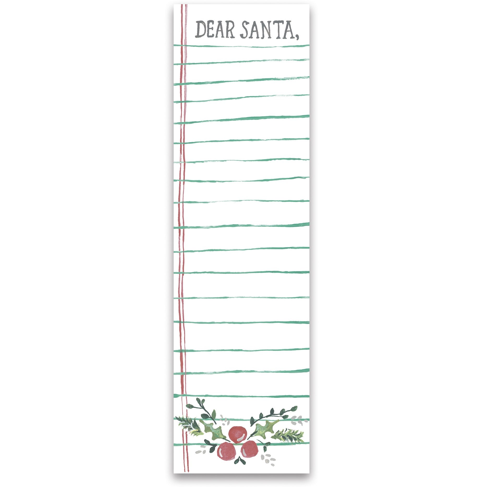 A watercolor art-inspired magnetic paper list notepad lending a "Dear Santa" sentiment with holly design and lined notebook paper background. Contains 60 pages. Complements well with coordinating design pieces for a festive collection.