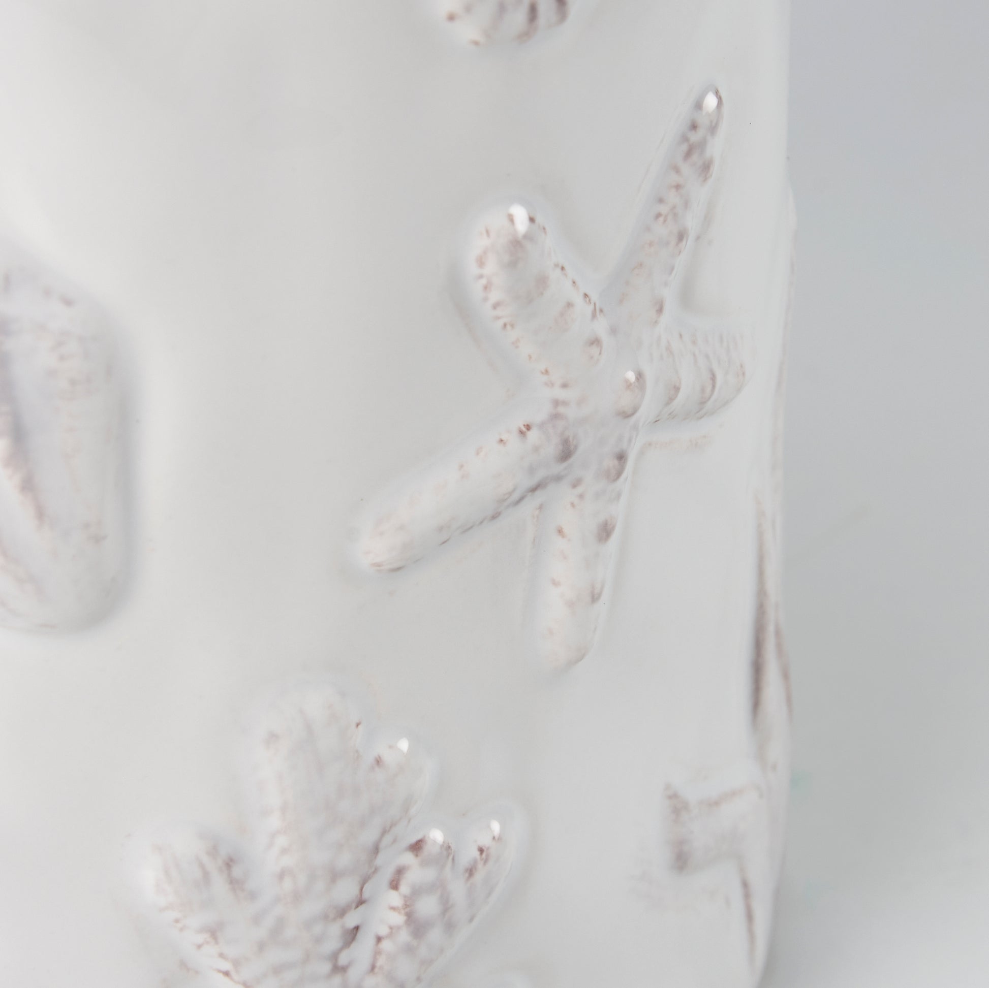 A lightweight, but durable ceramic pitcher displays a clean white glaze finish with embossed designs of various sea life and ocean plants around the outside. Embossed ocean designs feature textured detail. Our Beach pitcher is microwave, dishwasher, and food safe for convenient use. A piece of everyday tableware perfect for oceanic themed gatherings.