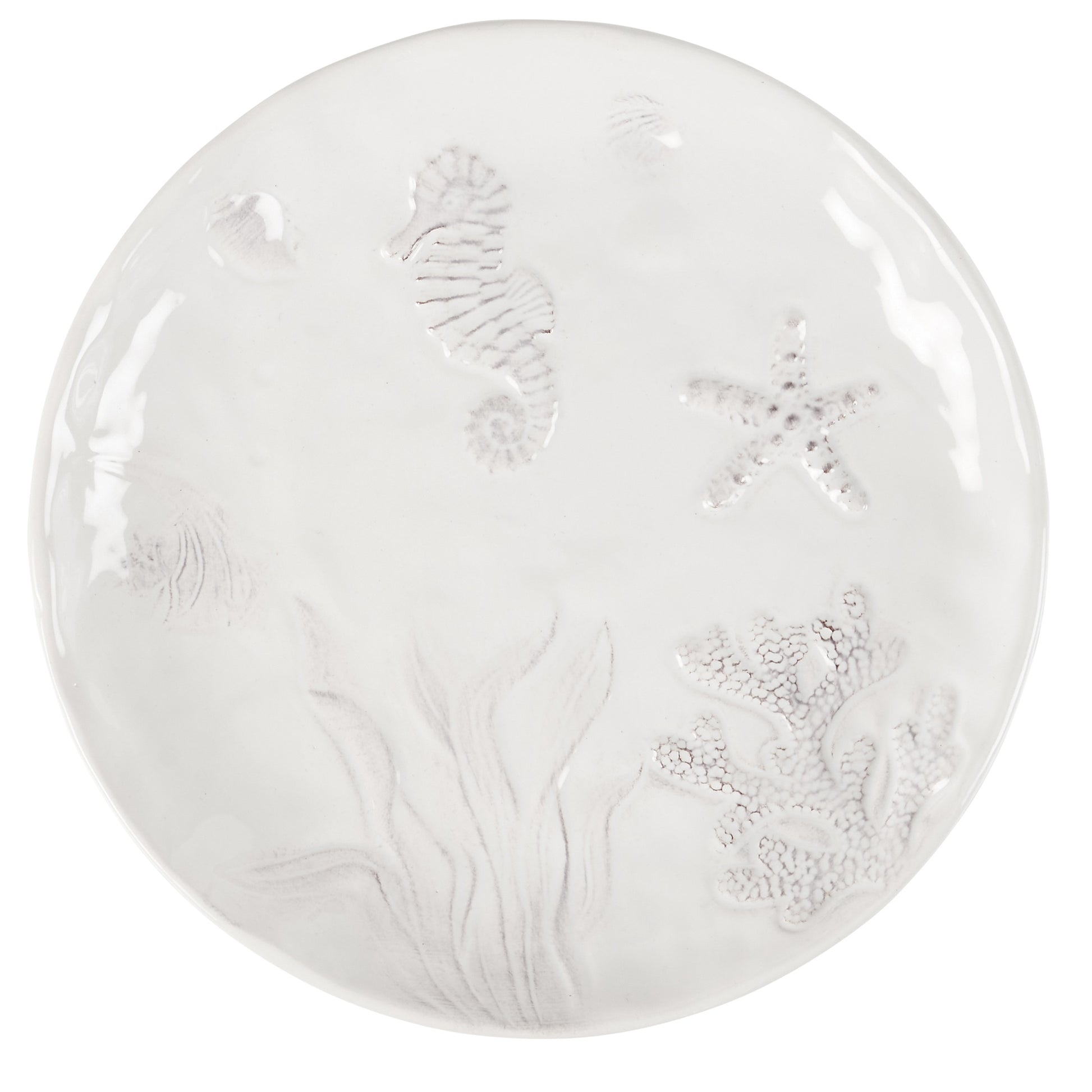 A lightweight, but durable ceramic salad plate displaying a clean white glaze finish with embossed designs of various sea life and ocean plants on the plate. Embossed ocean designs feature textured detail. Our Beach salad plate is microwave, dishwasher, and food safe for convenient use. A piece of everyday tableware perfect for oceanic themed gatherings.