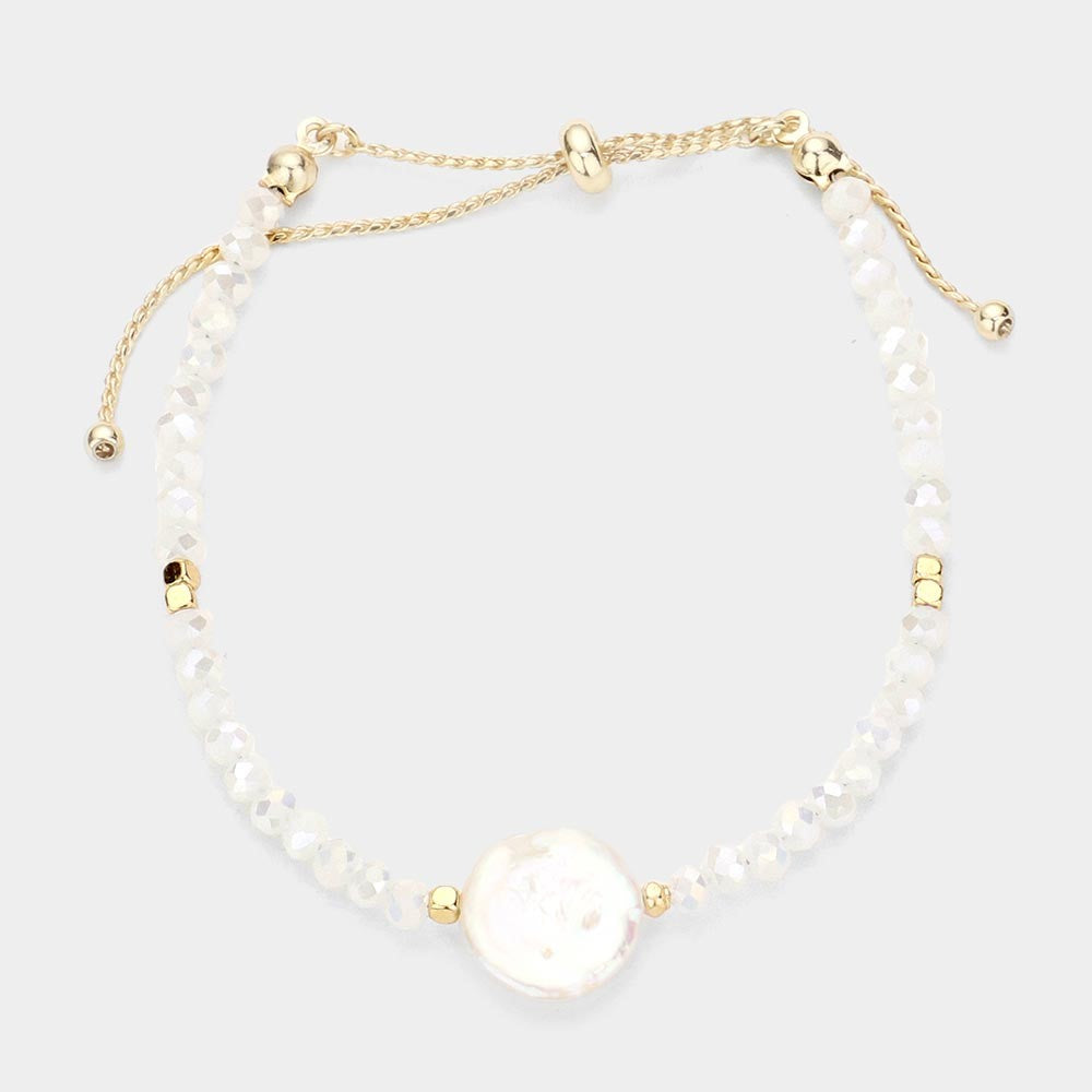 Freshwater Pearl Accented Faceted Pull Tie Cinch Beaded Bracelet (White)