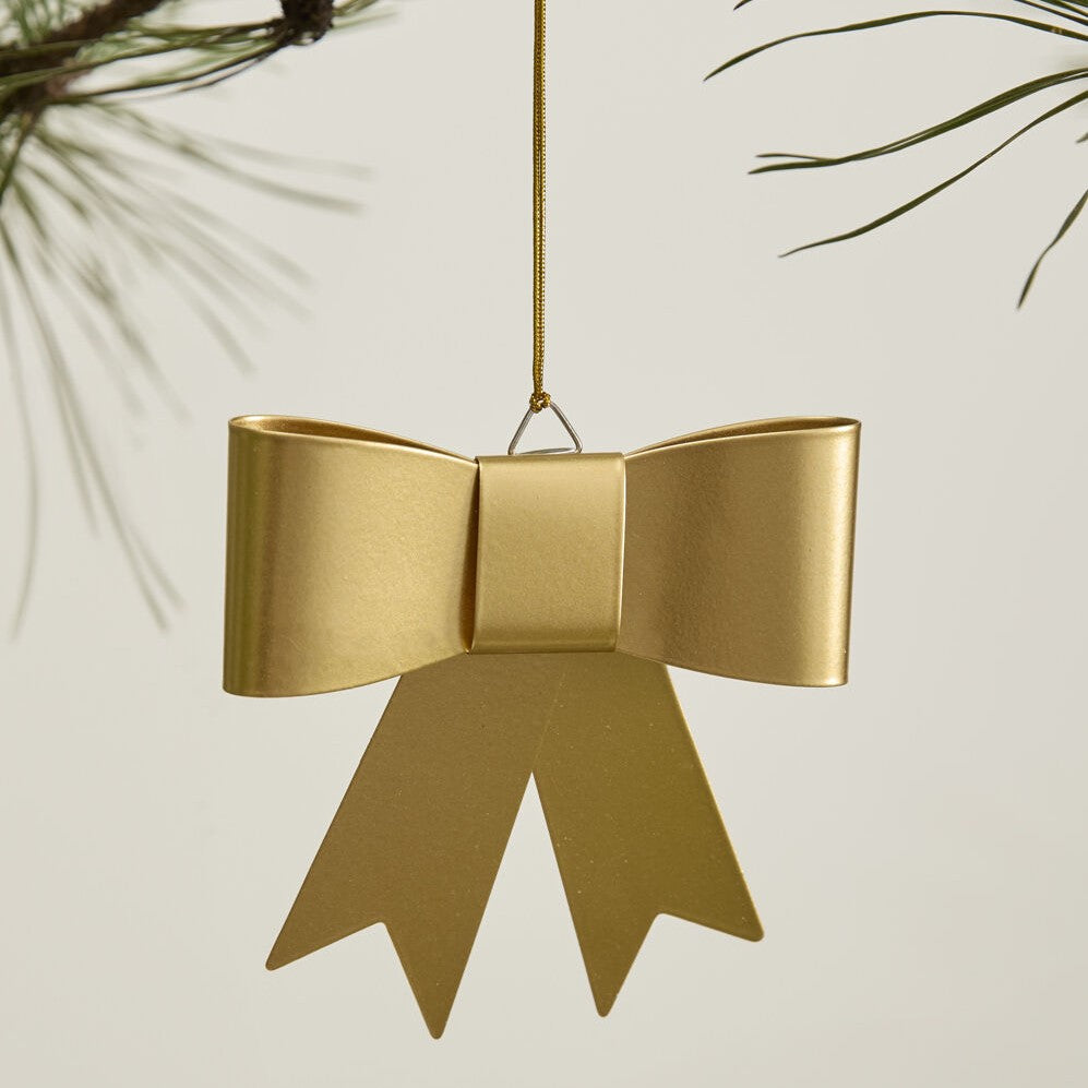 Wrap up holiday decorating with the Perfect Bow Ornament, the finishing touch on any gift or holiday display. In lightweight, folded sheet metal, this precious gold bow has rounded, dimensional sides and trimmed ends. Create a charming display with lots of these perfect bows styled on the tree, year after year.