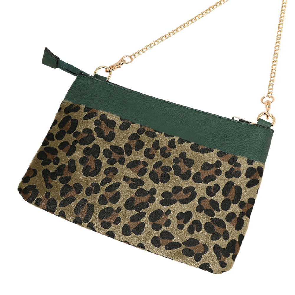 Leopard-accented faux leather crossbody bag that doubles as a purse or clutch. Trendy, versatile, and perfect for carrying essentials in style.