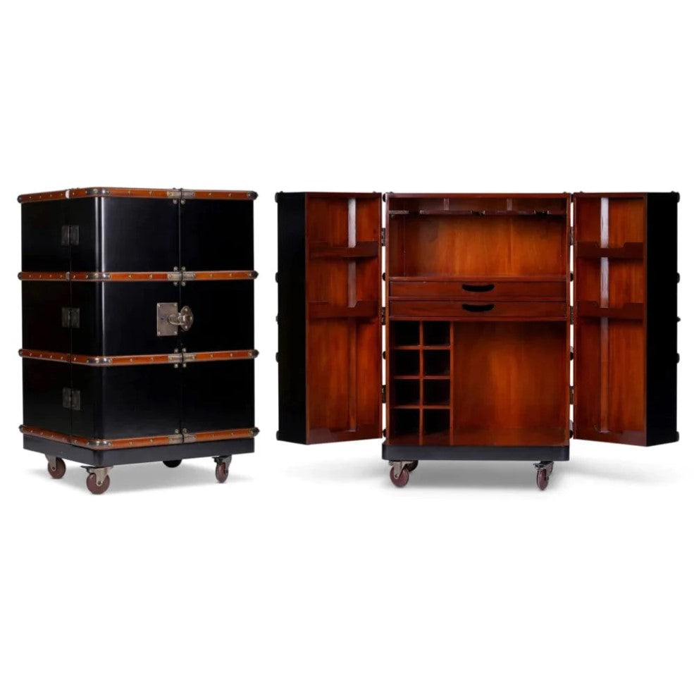 This handcrafted Polo Club Bar in Black is unique and in a class of itself. Hailing from the Belle Epoque, an era when armies of stewards and porters used to wheel trunks from the Wagons-Lits train to a waiting transatlantic steamer. Those were the days! Big enough for pur-sang bartending but small enough to fit into a chic studio. Built-in canvas-covered wood with leather accents and bronze hardware. Varnished wood slats for protection.