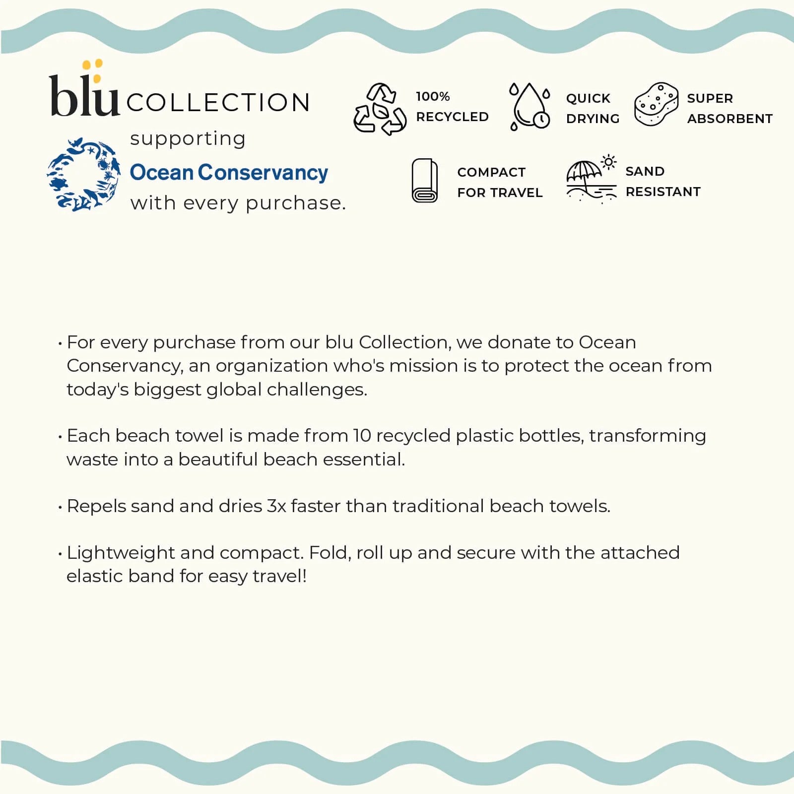 Made from post-consumer plastics, each of our beach towels effectively recycles the equivalent of 10 single-use plastic bottles. These oversized towels are designed for the beach (they're sand-resistant!), poolside, yoga and just about anywhere else a super absorbent towel is useful. Exceptionally durable and more lightweight than a traditional beach towel, they are quick-drying and fold and roll compactly for travel. And, as a bonus, the reversible design offers two super fun prints in one towel!