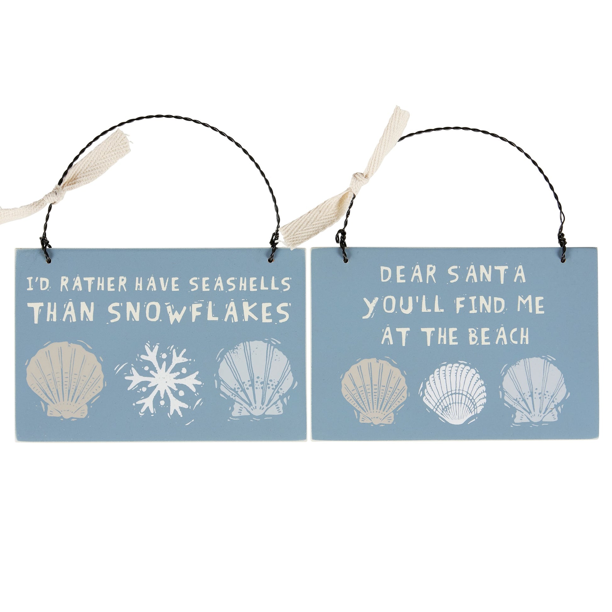 A wooden ornament set featuring a fun combination of Christmas and a love of the beach. Ornaments display individual holiday beach-themed sentiments that read "I'd Rather Have Seashells Than Snowflakes," and "Dear Santa - You'll Find Me At The Beach" with seashell and snowflake designs in a unique block print art style.