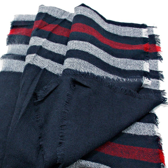 Striped Knit Shawl Scarf with Raw Fringe Trim (Navy Blue)