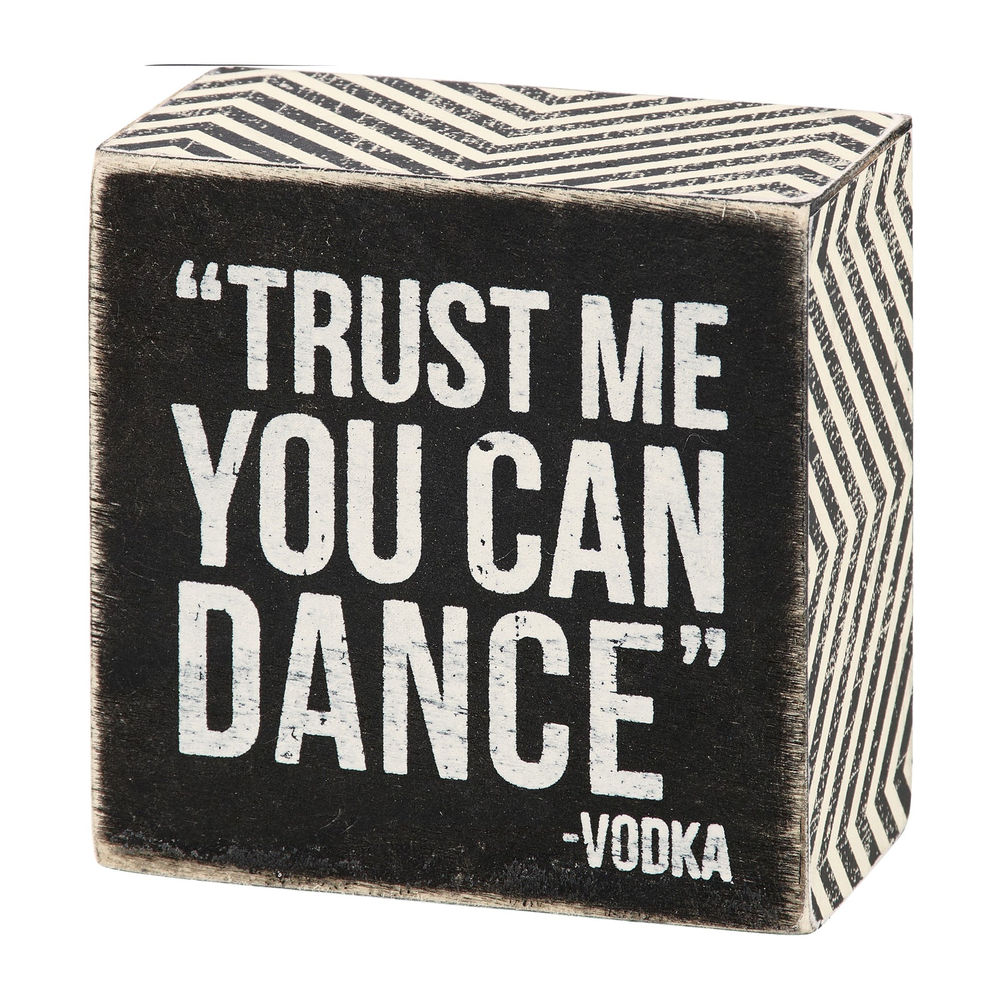 A classic black and white wooden box sign featuring a distressed "Trust Me You Can Dance - Vodka" sentiment. The Trust Me You Can Dance - Vodka sign is easy to hang or can free-stand alone.