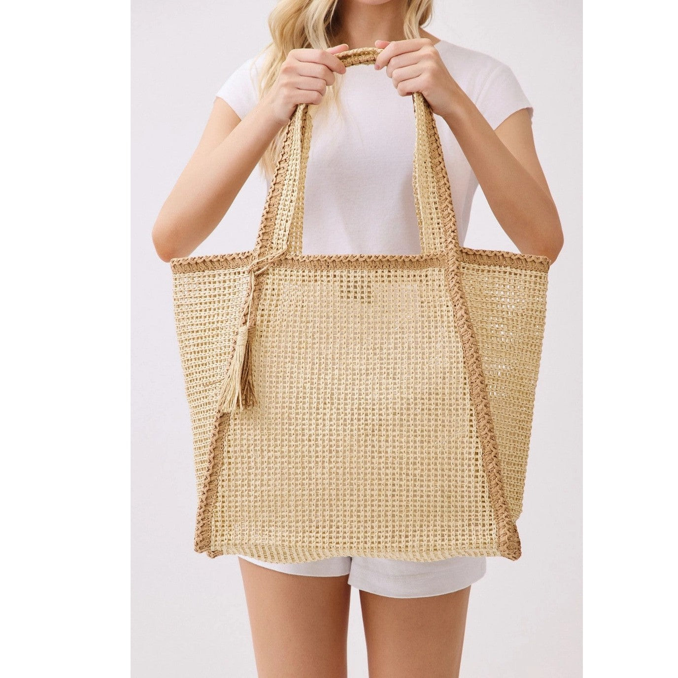 Effortlessly chic and endlessly versatile, this Two Tone Woven Straw Beach Tote is your go-to carryall for sunny days and weekend escapes. Handwoven with a beautiful open-weave texture, this lightweight tote features a natural two-tone design with contrasting trim for a timeless, coastal look. The roomy interior easily holds beach towels, sunscreen, magazines, or everyday essentials, while sturdy shoulder straps ensure comfortable carrying. Finished with a playful tassel detail, this tote transitions seamlessly from beach to brunch to market strolls.